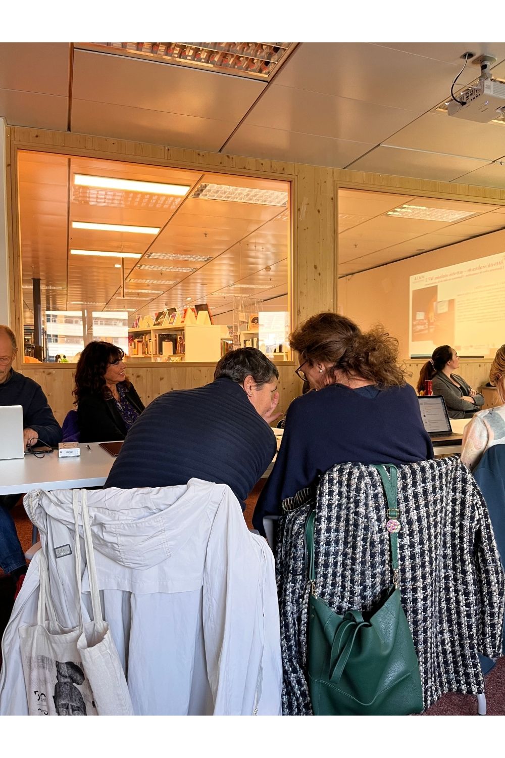 Il lavoro scorre rapido: interventi, discussioni, proposte si susseguono senza tregua. Una pausa c’è — quella del pranzo — con una zuppa calda e deliziosa, guarnita con fiori secchi (che su di me hanno sempre un certo effetto). Il tempo di un altro piatto fumante, e si riparte. Nel pomeriggio la Mediateca si anima di adulti e ragazz* che sbirciano curiosi dalle vetrate per capire cosa stiamo combinando.