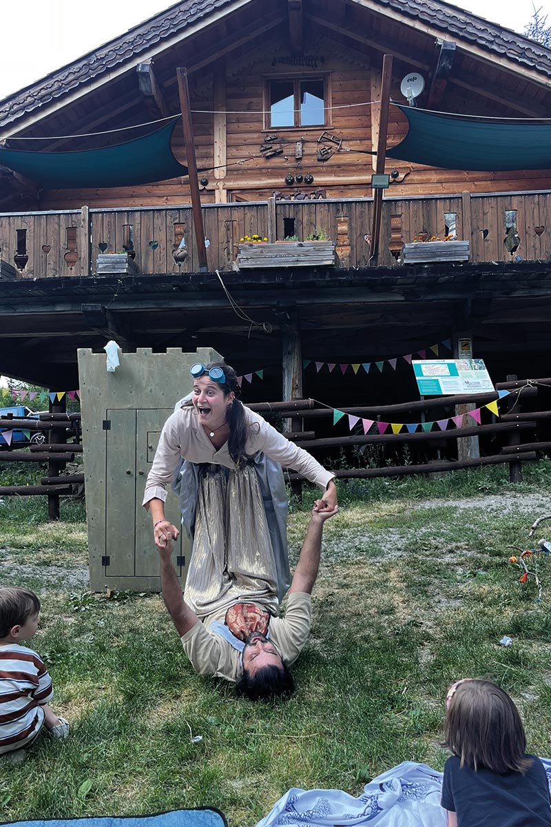 L’Office Régional du Tourisme, che organizza il tutto, è partner di MAIA. E così, quasi per incanto, una delle fiabe dell’estate 2025 è stata creata intorno al tema affascinante delle meraviglie archeologiche “invisibili”. Il luogo scelto per la prima rappresentazione è stato il Bois de Montagnoulaz, a Pré-Saint-Didier. Un sito archeologico scoperto nel 2003, scavato con cura, di grande valore scientifico. Ma qui inizia il bello, il “curioso”: il sito si trova sotto il ristorante Lo Carà, all’interno del Parco avventura Mont Blanc. Immaginatevi uno chalet di legno massiccio, appoggiato su piloni, come una palafitta, proprio sopra questi resti antichi. Non si vede, non si tocca, è lì, nascosto.