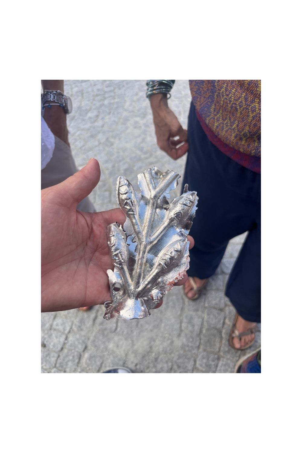 Mi avvicino incuriosita. Tra la cenere e il fuoco, il giovane artigiano versa con mano sicura uno stagno fuso, incandescente, dentro piccoli stampi di pietra. La massa liquida brilla di un bianco dorato, scorre lenta e viva, poi si raffredda e prende forma. Pochi colpi di martello, un leggero raschiare, ed ecco apparire, dal grigio della fuliggine, un oggetto scintillante e ramificato. È così luminoso, così perfetto nella sua semplicità, che mi viene d’istinto allungare la mano per toccarlo. Non sono la sola: anche gli altri visitatori si accalcano, attratti dalla magia di qualcosa che nasce davanti ai loro occhi.