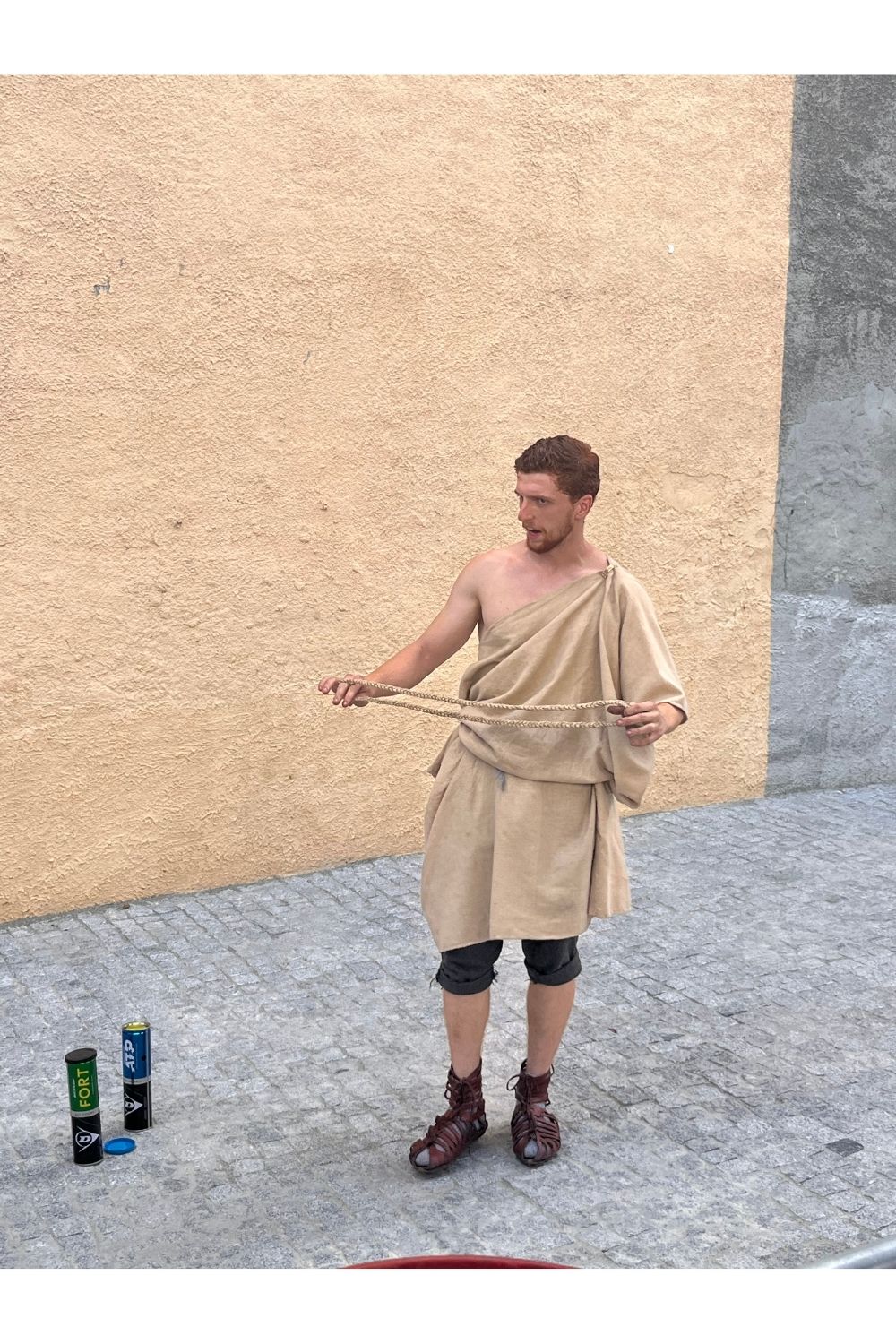 Per scoprirlo, mi lascio guidare fino al Teatro Romano, dove, nei giorni animati dall’evento “Veni, vidi Augusta”, prende vita un laboratorio didattico unico nel suo genere. Appena varcata la soglia del cortile, mi trovo immersa in un vero e proprio accampamento romano: tende, armature, utensili, e al centro — protagonista assoluto — un fabbro al lavoro nella sua bottega. L’aria è densa dell’odore del carbone e del suono ritmico del martello che batte sull’incudine.